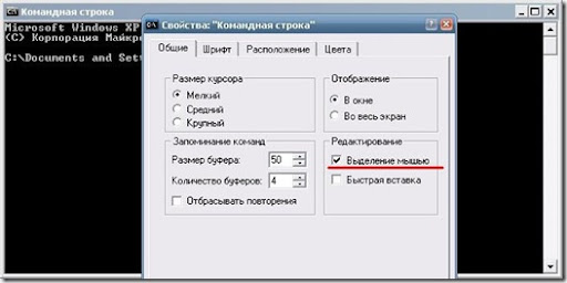 После запуска командной строки (Пуск->Программы->Стандартные) нажимаем правой кнопкой на заголовке окна. Выбираем пункт меню "Свойства". И на вкладке "Общие" ставим галочку "Выделение мышью". Жмем "ОК".